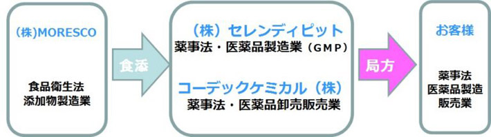 - 2. 食品添加物規格合格の「日本薬局方流動パラフィン」は(株)セレンディピットの医薬品製造業認可工場で局方化され、医薬品卸売販売業のライセンスを所有するコーデックケミカル(株)がお客様に販売しています。